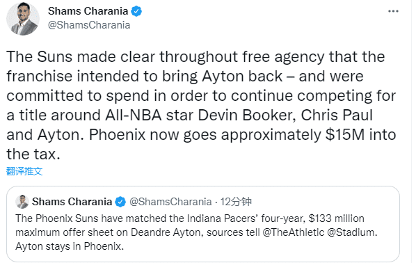 此前太阳为艾顿开出了金额为1640万美元的资质报价,从而让后者成为受限制自由球员,这样的话,太阳可以匹配其他球队的任何报价;今天步行者为艾顿开出4年1.33亿美元的历史最大邀请合同,随后太阳匹配合同,从而留下艾顿。