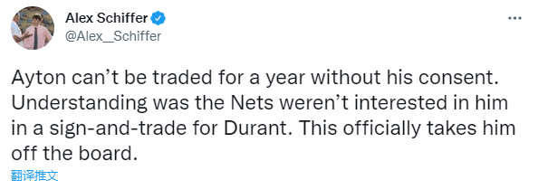 篮网记者Alex Schiffer解读太阳留下艾顿:未经同意,艾顿一年内不能被交易。可以看出的是,篮网对他(艾顿)先签后换杜兰特的交易并没有兴趣,这让他正式远离了这笔交易的讨论。