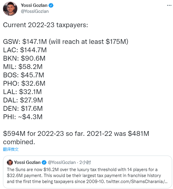 目前联盟多支球队总共需要缴纳5.94亿美元的奢侈税,勇士1.47亿美元高居联盟第一,快船1.45亿美元、篮网9060万美元以及湖人3210万美元。
