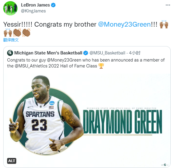来源:24直播网07-13 17:2924直播网07月13日讯 ,今日美国密歇根州立大学男篮官方宣布,勇士球员德拉蒙德-格林正式入选该校名人堂;湖人球星詹姆斯为他送上祝贺,发推写道:太棒啦!!恭喜我的兄弟!