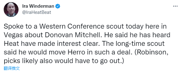 热火随队记者Ira Winderman报道,某西部球探表示他已听闻热火对于得到米切尔表达出了明确的兴趣。该球探还表示,如果他是热火高管,会愿意为了得到米切尔付出希罗、邓肯-罗宾逊和选秀权。