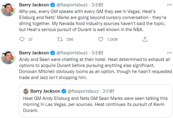 据热火随队记者Barry Jackson报道,热火总经理安迪-埃利斯伯格与篮网GM肖恩-马克斯今天在拉斯维加斯进行了会面交谈,热火决定用尽所有资产来探索所有的方式追求杜兰特;热火和篮网两队总经理不仅在酒店里会谈,而且两人相约一起吃饭。另外米切尔也是热火心仪的引援目标,虽然米切尔没有申请交易,爵士也没用兜售他,但联盟高管相信米切尔将在某个时刻被交易。