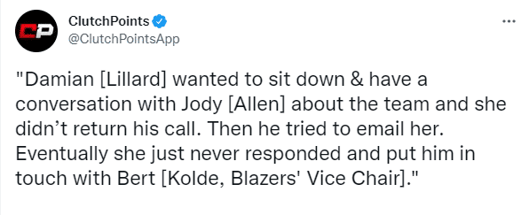 此前美媒爆料开拓者老板拒绝和利拉德交流,透露利拉德想要坐下来和开拓者老板乔迪-艾伦讨论球队的问题,但她没有回电话;然后利拉德给她发电子邮件,最终她没有回复,并且让利拉德与伯特联系(开拓者副总裁)。