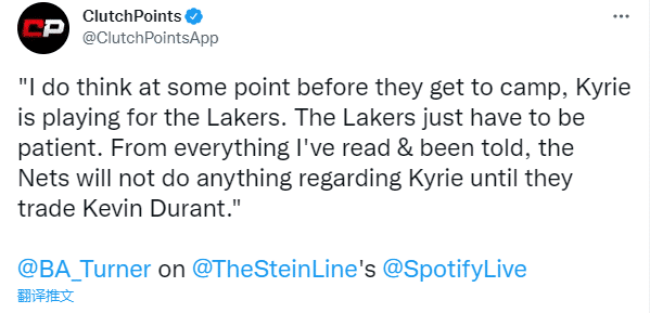 欧文何时能够加盟湖人?湖人记者Brad Tuener表示:在进入训练营之前的某个时间点,欧文将会为湖人效力,湖人只需保持耐心;在送走杜兰特之前,篮网是不会交易欧文的。
