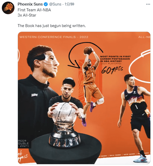 太阳官方晒出布克生涯荣誉集锦,并且配文写道:3次全明星和最佳一阵,布克的生涯才刚刚开始。
