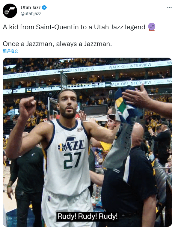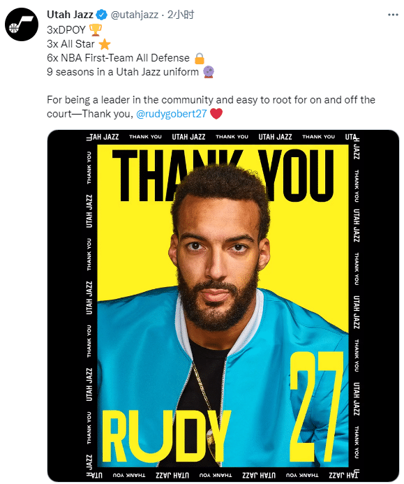 爵士正式告别戈贝尔,称其为爵士传奇,曾经是爵士人,永远是爵士人;爵士官方还晒出戈贝尔的荣誉——3次DPOY年度最佳防守球员、3次全明星、6次最佳防守一阵。