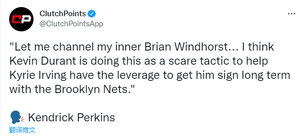 对于篮网闹剧,名嘴帕金斯表示:杜兰特现在想要被交易是毫无意义的,我认为凯文-杜兰特这样做是为了帮助欧文获得最大顶薪续约的恐吓策略。