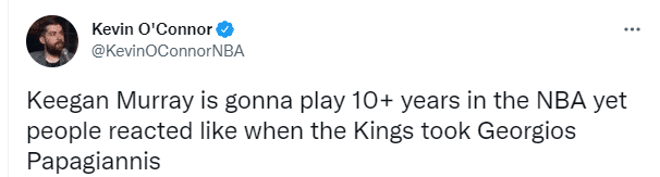 对于基根-穆雷的表现,NBA名记凯文-奥康纳发推直言:穆雷将在NBA至少打10年。