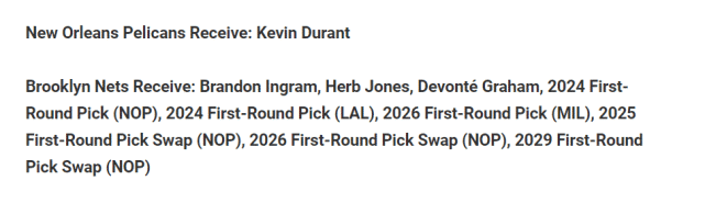 篮网得到:英格拉姆、赫伯-琼斯、格拉汉姆、2024年首轮(鹈鹕)、2024年首轮(湖人)、2026年首轮(雄鹿)、2025年首轮互换(鹈鹕)、2026首轮互换(鹈鹕)、2029年首轮互换(鹈鹕)。