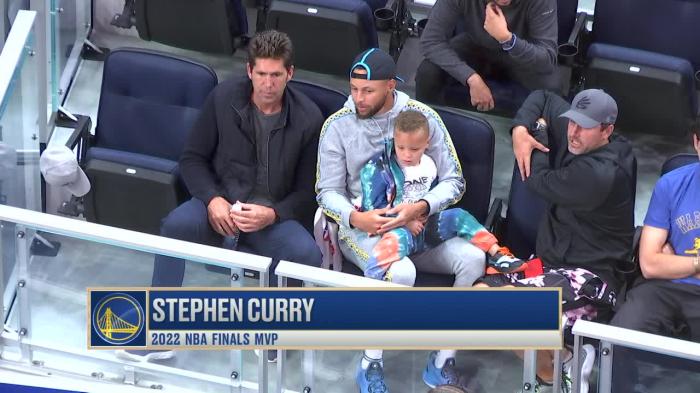 库里身穿运动装并且反戴棒球帽,带儿子卡农观战NBA夏季联赛现;场的字幕大大的写着:2022年NBA总决赛MVP;勇士总经理鲍勃-迈尔斯坐在库里身旁,另外勇士老板拉科布也在现场,库里妹夫达米安-李也来了,妹夫已经离开勇士,新赛季他将为太阳效力。