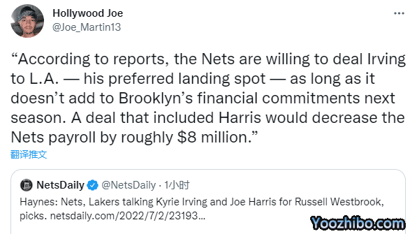 欧文有可能比杜兰特更早离队;有报道称篮网愿意把欧文交易到他想去的湖人,只要不增加篮网新赛季的开支;一笔包括乔-哈里斯的交易可以让篮网工资减少大概800万美元。