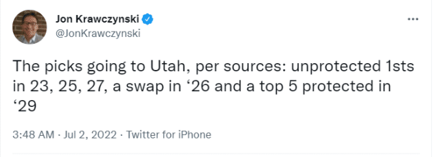 来源:24直播网07-02 12:0724直播网07月02日讯 ,据名记Woj报道,森林狼和爵士达成了一笔重磅10换1交易,森林狼将马利克-比斯利、贝弗利、凯斯勒、范德比尔特、博尔马罗和4个首轮签送往爵士,得到了三届最佳防守球员鲁迪-戈贝尔,具体的4个签是2023年、2025年和2027年的首轮,均为无保护,2029年是前五保护。后续报道称,森林狼还获得2026年首轮互换权。