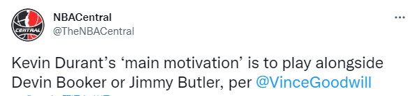 来源:24直播网07-02 11:1624直播网07月02日讯 ,杜兰特申请离开篮网事件引发巨大热议,为何杜兰特会把太阳和热火视为首选下家呢?背后原因曝光,据美媒报道,杜兰特的主要动机是想要布克和巴特勒一起打球。