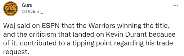 ESPN名记沃纳罗斯基在节目中表示:勇士队今年夺得总冠军,随之而来的巨量批评和质疑声音冲向了凯文-杜兰特,我觉得这是导致杜兰特要求交易的导火索。