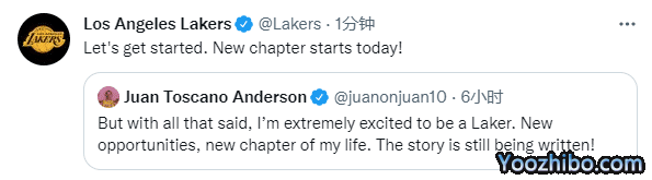 湖人官方还转发安德森告别勇士以及展望湖人生涯的推文,回复道:让我们一起开始,新的篇章从今天开始。