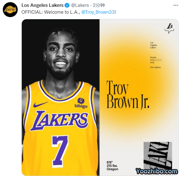 湖人官宣签约特洛伊-布朗,晒他身穿湖人球衣照并且发推写道:欢迎来到洛杉矶;21-22赛季,特洛伊-布朗为公牛出战66场比赛,场均拿到4.3分3.1篮板1.0助攻;布朗将身穿7号球衣,这是甜瓜安东尼之前的球衣号码,这意味着瓜哥很可能离队。