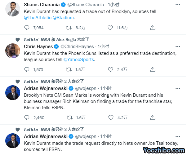 杜兰特申请离队,他最想去的球队是太阳和热火,据Brett Siegel报道,如果条件允许的话,篮网似乎非常希望用杜兰特从太阳换回艾顿以及一些选秀权,还记者爆料篮网向太阳索要布克;目前太阳已经瞄准杜兰特,但他们不想为了杜兰特一人而毁了一支球队。