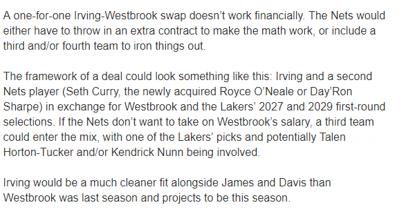 目前湖人队的引援重点是欧文,他们已经把欧文列为头号引援目标,杜兰特申请离队让湖人得到欧文的几率大增;Sam Amick列为湖人和篮网促成欧文交易的方案:一种交易框架是篮网把欧文和其他两名球员(赛斯-库里和小奥尼尔或者夏普)交易到湖人,得到威少和2027年、2029年首轮选项权,相当于是一笔3换3的交易方案。
