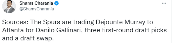 来源:24直播网06-30 11:2124直播网06月30日讯,老鹰和马刺正在敲定一笔交易,据ESPN名记沃纳罗斯基和shams联合报道,老鹰把加里纳利和三个首轮选秀权(2023、2025和2027年首轮签)和1个选秀互换权交易到马刺,从而得到穆雷;老鹰5换1引援全明星后卫,新赛季穆雷将搭档特雷-杨出战,吹杨本人欣喜若狂。
