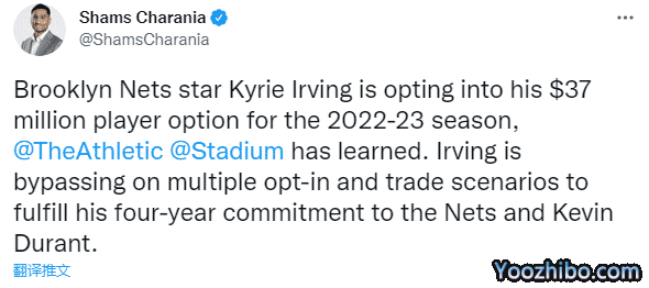 NBA薪资专家Bobby Marks表示欧文有资格在7月1日和篮网续约,或者以不受限制自由球员进入2023年;执行球员选项后,篮网有权把欧文交易到其他29支球队中的任何一支。