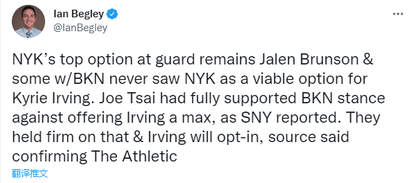 对于欧文能否续约,据纽约记者Ian Begley报道,篮网老板蔡崇信完全支持(fully supported)球队不给欧文顶薪的立场,他们始终认为欧文会选择执行球员选项。