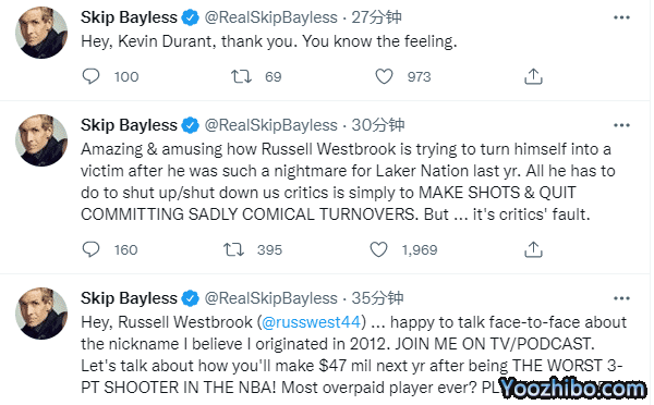 Skip继续发推:神奇又好笑,威少在成为湖人队的梦魇之后,是如何把自己变成受害人的呢。想让我们闭嘴,他需要做的仅仅是命中投篮,并减少那些让人上头又滑稽的失误。但现在,这成了评论员的错了