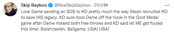 Skip回击威少之后,又发推写道:利拉德向杜兰特发送求救信号的方式就像库里招募杜兰特来拯救他的遗产;在美国队金牌争夺战中,利拉德两罚不中,是杜兰特让利拉德摆脱了困境,杜兰特对利拉德说让我被犯规执行罚球:嗖嗖,终结比赛。