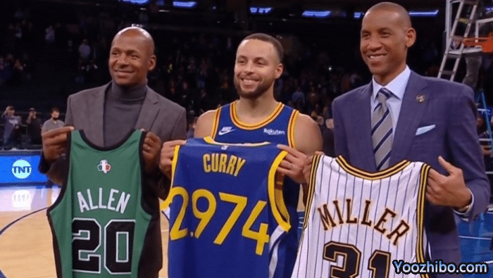 库里在2021年12月15日击败尼克斯的比赛中,正式加冕NBA三分王,正式超越雷阿伦。三分榜单上排名第二和第三的雷阿伦和米勒为库里送上了一件标有数字2974的纪念衫,这一天库里迎来里程碑的时刻。
