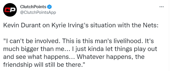 对于欧文的离队闹剧,杜兰特在节目中表示:我根本没有参与其中,我的意思是,这是他的生计,这比我重要得多,成为自由球员是球员生涯最重要的时刻之一,所以这不能被任何人所左右,我只是让事情发展,看看到底会发生什么;这事超出了我的控制范围,我不想参与其中,你知道我的意思吗?