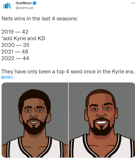 2019年,杜兰特和欧文联手加盟篮网,但期间篮网的战绩并不好;美媒StatMuse晒出了欧文、杜兰特加盟后篮网的历年常规赛战绩,具体战绩为:18-19赛季42胜,19年夏天欧文和杜兰特加盟球队后19-20赛季35胜,20-21赛季48胜,21-22赛季44胜。美媒还表示:在欧文加盟后,篮网仅一次进入东部前四。