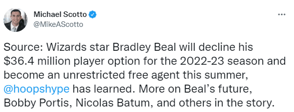 来源:24直播网06-22 15:3824直播网06月22日讯 ,据Hoopshype名记Michael Scotto报道,奇才球星布拉德利-比尔拒绝执行下赛季3640万美元的球员选项,将成为完全自由球员,今夏有资格续签5年2.48亿美元大合同。