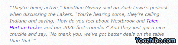 Jonathan Givony表示,湖人在交易市场上很活跃,他们给步行者打电话,想用威少、霍顿-塔克和2026年首轮选秀权(这里有误,湖人能交易的选秀权是2027年和2029年首轮签)交易得到布罗格登,对此步行者笑着回应:不,谢谢,我们还有比这更好的交易。