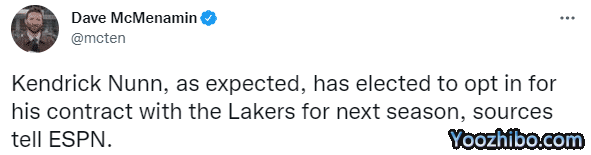 另外据Dave McMenamin报道,湖人球员纳恩将执行下赛季520万美元的球员选项,2021-22赛季,因遭遇右膝盖骨挫伤,纳恩缺席了所有的常规赛,因伤报销一场都没打,新赛季他将伤愈归来。