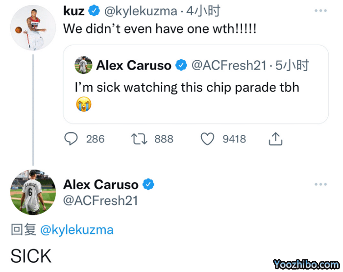 卡鲁索和库兹马在湖人当过队友,两人一起在2020年为紫金军团夺得NBA总冠军,但因为疫情的原因,导致他们10月份夺冠之后无法在洛杉矶举办总冠军游行。后期詹姆斯也多次表示非常遗憾,所以这次看到勇士夺得NBA总冠军之后进行城市游行,湖人的球员们都感到有些难受,他们也本该和洛杉矶的球迷们一起享受总冠军带来的荣耀,却遗憾没有进行。