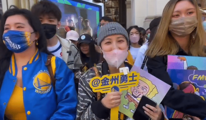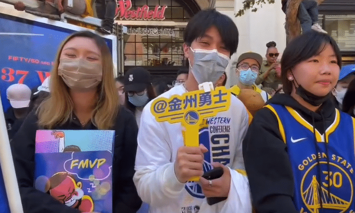 不得不说,中国的球迷们还是非常疯狂的,有人是从北京、天津飞过去的,还有很多是当地的学生或者在那里生活的人,甚至还有从加拿大奔赴旧金山,就是为了在现场一度新科NBA总冠军得主,同时与勇士全队和球迷们一起庆祝总冠军。