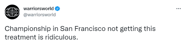 对此勇士媒体Warriorsworld发推写道:总冠军在旧金山没有演讲和集会太荒谬了。