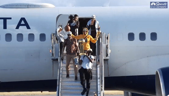 勇士全队下机之后,库里扛着FMVP奖杯并且抱着篮球接受采访,还和机场的一些人击掌庆祝,之后登上大巴;格林全程抱着奥布莱恩杯。