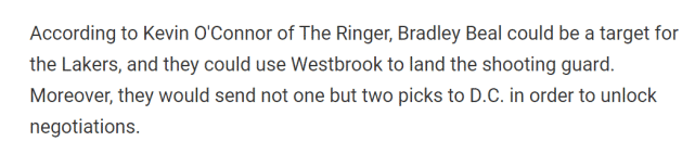 来源:24直播网06-17 18:1024直播网06月17日讯 ,The Ringer名记凯文-奥康纳认为如果有合适的目标,湖人依然会愿意交易威少,甚至附带上选秀签。他在播客节目上表示,湖人可以追求奇才的比尔,并用威少和两个首轮签作为筹码去开启交易谈判。