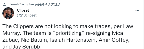 据报道,快船没有进行交易的打算,他们将优先考虑续约祖巴茨、巴特勒、哈滕施泰因、科菲和杰伊-斯克鲁布;新赛季,小卡将会伤愈归来,携手乔治带队再次冲击总冠军。
