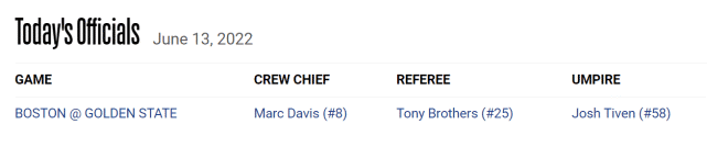 44岁的约什-蒂文执哨勇士8场季后赛,勇士7胜1负,执哨8场凯尔特人季后赛,凯尔特人只有2胜6负。和布拉泽斯一样,蒂文也执哨了今年的总决赛G2。