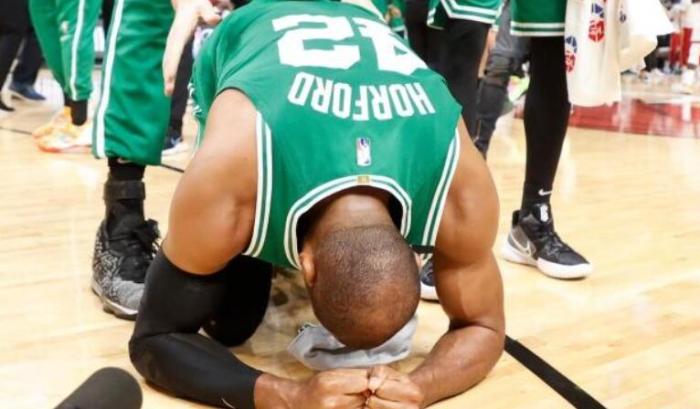 在本赛季的季后赛中,霍福德在凯尔特人阵中发挥了极为重要的作用。尤其在对阵雄鹿的系列赛中,霍福德一度隔扣字母哥,并且轰下个人季后赛最高的30分。在对阵热火的抢七大战中,霍福德抢下14个篮板球,成为绿军内线的重要支柱。比赛胜利之后,霍福德激动万分,他跪在地上狠狠捶打地板,释放自己压抑多年的情感。