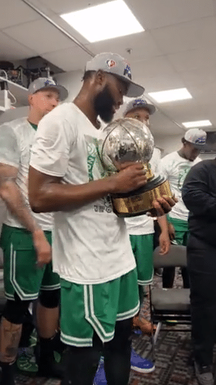 凯尔特人晋级总决赛赛后,全队在更衣室庆祝,绿军主帅乌度卡发表讲话时,全队突然朝他泼水庆祝,多名球员爆粗口,现场氛围太热闹;之后乌度卡继续讲话,塔图姆抱着东决MVP奖杯,全程站在椅子上抱着奖杯不撒手,全程咧嘴大笑太开心。