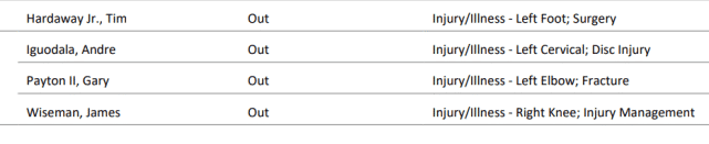 来源:24直播网05-20 14:4524直播网05月20日讯,NBA官方公布了西决G2的伤病报告,勇士和独行侠共有4人缺席。独行侠一方缺阵的是小哈达威,他因左脚伤势已经赛季报销。勇士一方缺阵的人员也没有变化,伊戈达拉(颈椎伤病)、小佩顿(左肘骨折)和怀斯曼(右膝伤病)将继续缺席G2的比赛。