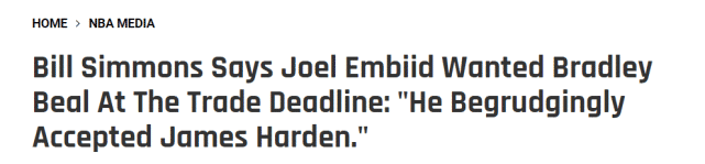 “如果比尔和哈登先签后换的赔率是8-1或者7-1,我都会打这个赌。因为这是恩比德在二月份想要的人,我当时就报道过这件事,没人相信我。那(比尔)才是他们一直想要的,只不过后来比尔受伤了,恩比德只能不情愿地接受了哈登的交易。”Bill Simmons在自己的播客节目上说道。