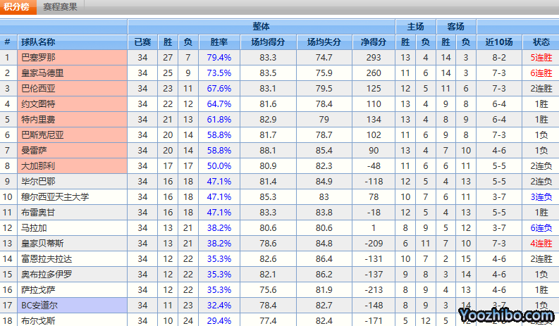 来源:24直播网05-16 15:5324直播网05月16日讯 本赛季西班牙篮球甲级联赛常规赛正式落下帷幕,巴塞罗那27胜7负排名第一,力压皇家马德里的25胜9负,一共18支球队,前8名晋级到季后赛,最后一名垫底的球队将会降级。很遗憾,本赛季西甲垫底的球队是布尔戈斯,他们战绩定格在10胜24负,排名倒数第一,降级到乙级联赛。