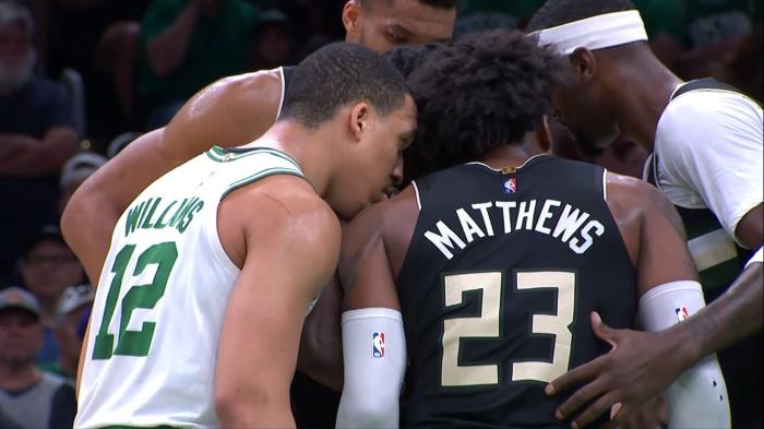 上半场还剩0.9秒,斯玛特和泰斯在外线疯狂包夹字母哥,斯玛特抢断之后被字母哥打手犯规,裁判吹罚字母哥投篮犯规,斯玛特获得三次罚球的机会,如此吹罚引争议,勇士球星德拉蒙德-格林发推写道:哇哦,不太好吹的一球;米切尔发推:在抢七比赛中这样吹吗?