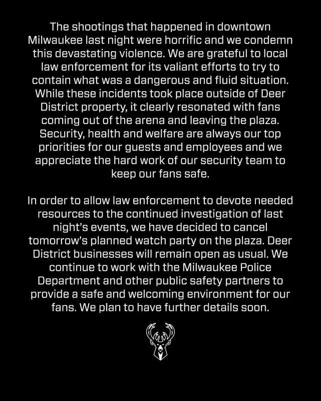 雄鹿官方已经发表声明,他们写道:“我们感谢当地执法部门为遏制危险而多变的局势所付出的英勇努力, 虽然这些事件发生在Deer District外,但这显然影响了球迷的安全。这是我们要首先考虑到的,感谢我们辛勤的安保团队,确保球迷的安全。”
