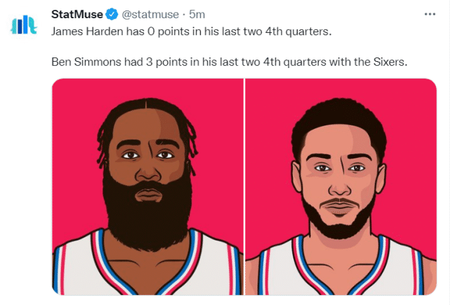 第三,哈登过去两场的第四节都没有得分。西蒙斯在76人生涯最后两场的第四节还得到3分。又一个用西蒙斯来扎心哈登的数据。