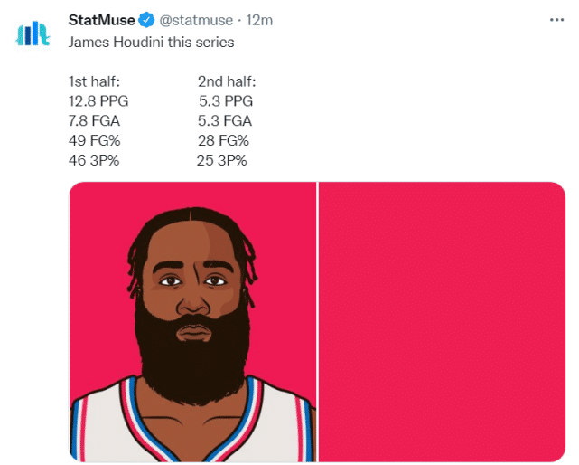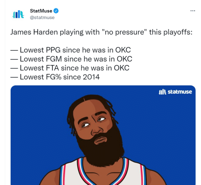 第五,Statmuse还嘲讽哈登在季后赛打球毫无压力(这是哈登的原话)。他的场均得分、场均出手数和场均命中数均为雷霆时期以来新低。他的投篮命中率也是2014年以来新低。
