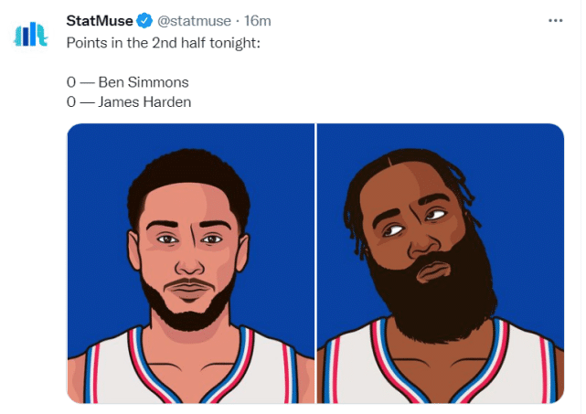 第一,哈登本战下半场0分,Statmuse调侃西蒙斯下半场也是0分。本赛季西蒙斯并未替76人和篮网上过场,说他下半场0分倒也没问题。放在一起,显然扎心哈登!